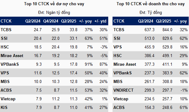 Hai vị trí dẫn đầu về cả dư nợ cho vay và doanh thu cho vay lần lượt thuộc về TCBS và SSI. Trong đó, TCBS đứng đầu thị trường với quy mô dư nợ kỷ lục hơn 33.8 ngàn tỷ đồng, tăng 30% so với đầu năm và doanh thu cho vay đạt 844 tỷ đồng, tăng 32% so với cùng kỳ năm trước. Xếp ngay sau là SSI với dư nợ hơn 33.1 ngàn tỷ đồng, tăng 51% so với đầu năm, đồng thời mang về hơn 829 tỷ đồng doanh thu, tăng 62% so với cùng kỳ năm trước.
